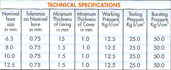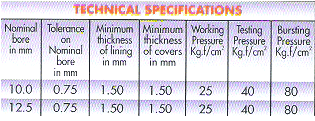 | Nominal bore in mm | Tolerance on Nominal bore in mm | Minimum Thickness of lining in mm | Minimum Thickness of Covers in mm | Working Pressure Kg.f/cm2 | Testing Pressure Kg.f/cm2 | Bursting Pressure Kg.f/cm2 | Working Pressure Kg.f/cm2 | Testing Pressure Kg.f/cm2 | Bursting Pressure |